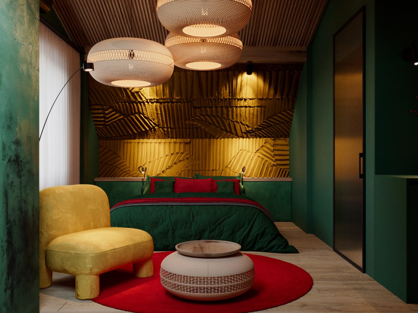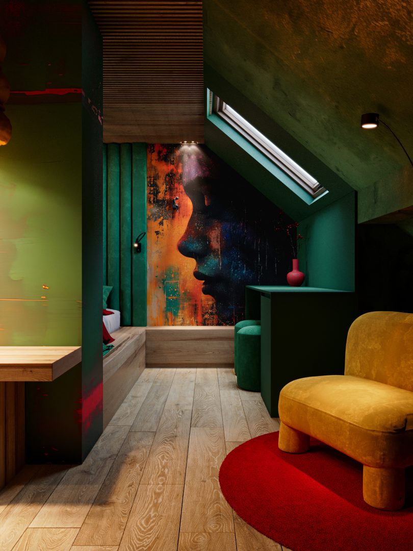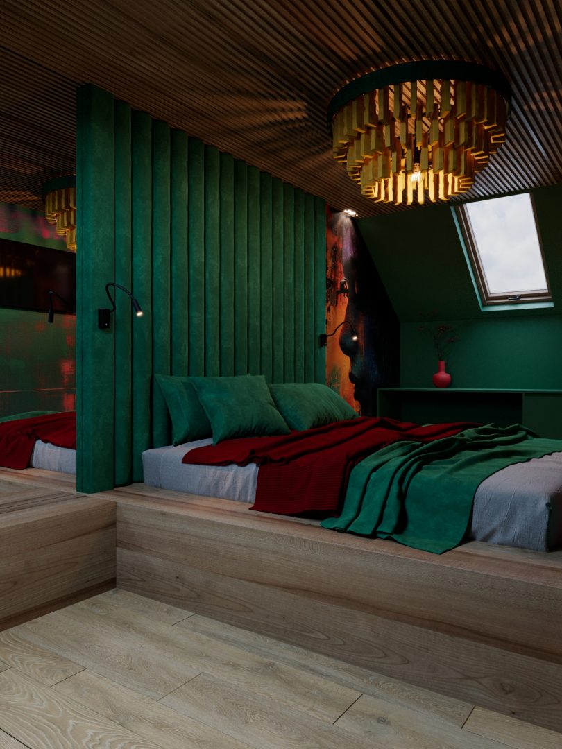 Мансардний номер з авторським дизайном, в якому чудово поєднана сучасна арт естетика та елементи декору, що характерні історії даного регіону. В ньому розташоване 2 двоспальних ліжка 2 м Х 2 м,, відпочинкова зона під вікном, (перешкоджають проникненню сонячного світла, що підвищує комфорт вашого відпочинку у момент сну). На підлозі паркетне покриття. Кондиціонер.