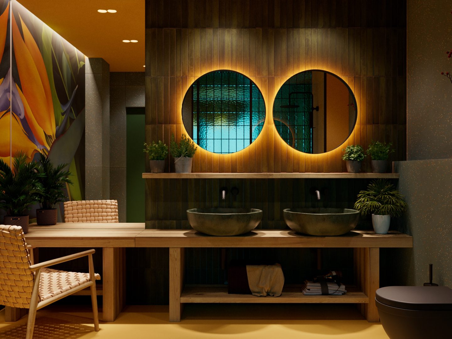 Підлога з підігрівом, туалет, душова на рівні підлоги забезпечить вам комфорт і простір, 2 умивальника, дзеркало з LED-підсвіткою, фен, 4 халати, капці, засоби особистої гігієни, 8 рушників.
